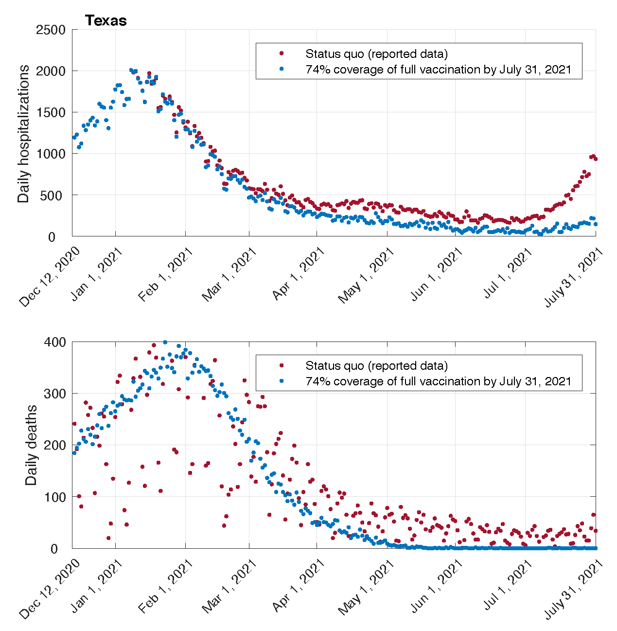 Estimated Impact of Higher COVID-19 Vaccination Coverage on Hospitalizations and Deaths in Texas, by July 31, 2021