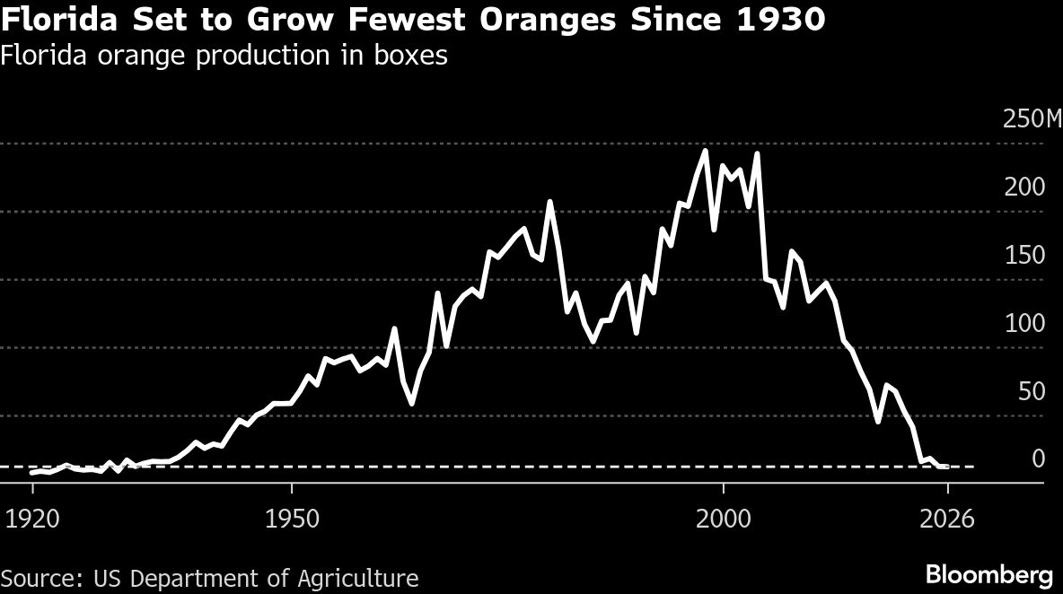 The state is seen producing 12 million boxes of fruit in the 2025-26 season, down 2% from the prior year, the US Department of Agriculture said in its first forecast for the season. That output, the lowest since 1930, comes as Florida’s historical orange groves continued to be removed following years of disease and the impacts of Hurricane Milton at the end of 2024.