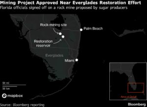 The mine would be located about 60 miles west of Palm Beach, atop an L-shaped patchwork of lush cane fields. The site is also about 1,000 feet from a roughly $4 billion reservoir that the US Army Corps of Engineers and the South Florida Water Management District, an agency responsible for protecting water resources in the region, is building to clean the waters that feed the Everglades.