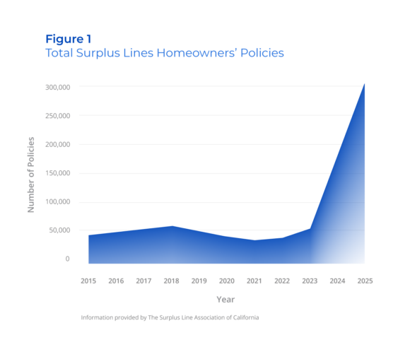 Today, with another full year of data, the trend has advanced into a new—and even more unexpected—phase. As shown in Figure 1, total surplus lines homeowners insurance policies did not merely continue rising—they spiked past 300,000 in 2025, a level without precedent. What had been a rebound in 2023, and a structural shift in 2024, has now become a full‑scale realignment of where California homeowners obtain coverage.