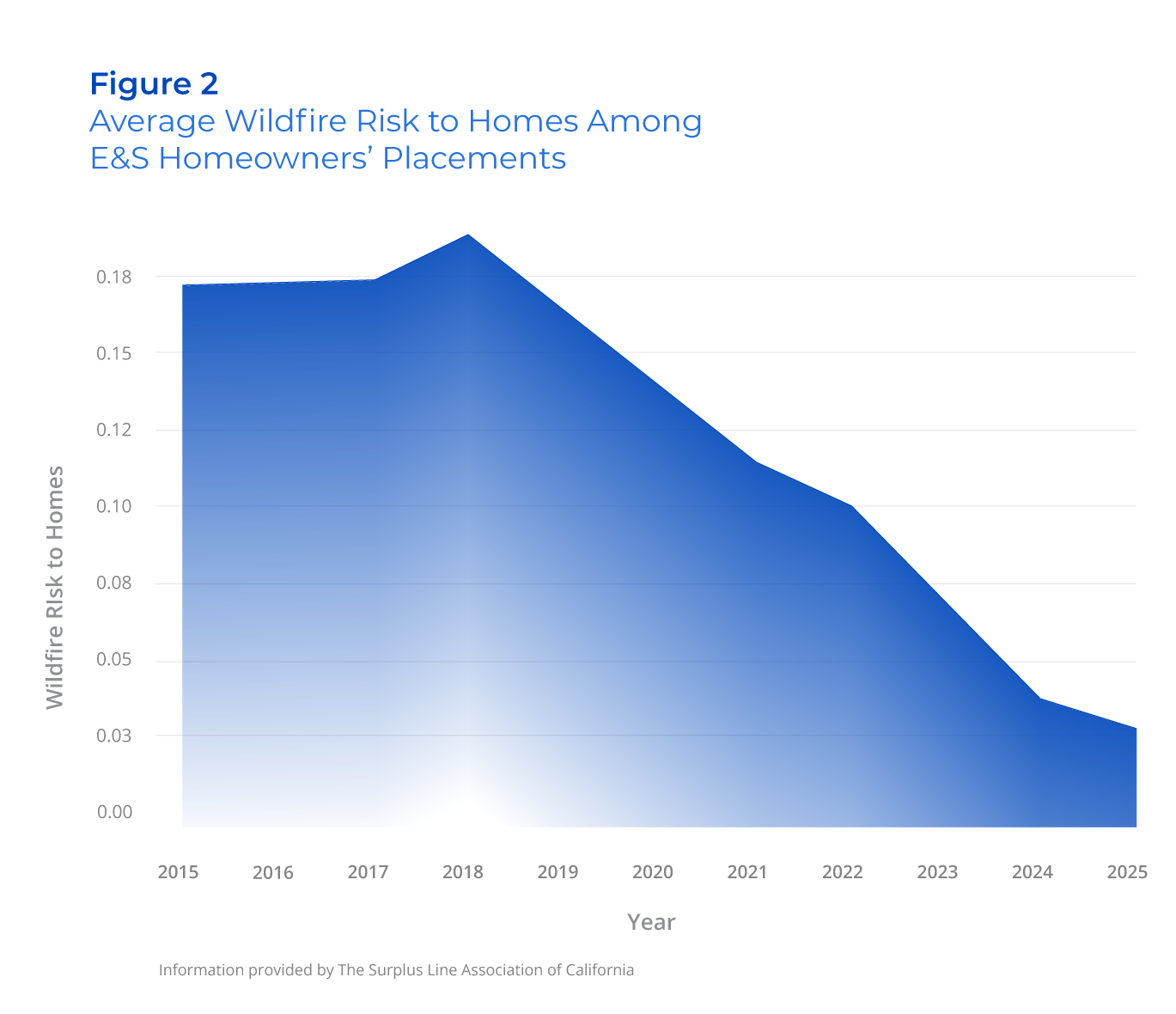 Risk to homes combines the likelihood of wildfire, modeled fire intensity and potential structure damage, providing a more property-specific view of hazard. When SLACAL first reported the decline in wildfire hazard in 2025, it appeared to be a temporary artifact of admitted‑market stress. Instead, the trend has strengthened. As shown in Figure 2, portfolio‑wide risk to homes has now fallen to its lowest level, continuing a multi-year decline even as E&S volume surged past 300,000 policies. This pattern persisted despite California’s severe 2025 wildfire season and the resulting strain on insurer capital. While admitted carriers understandably restricted new business, the homes entering E&S in 2024 to 2025 showed lower, not higher, underlying wildfire hazard.