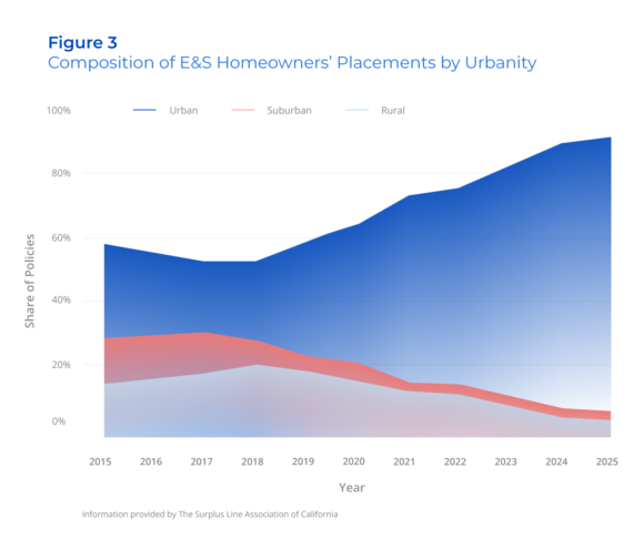 This is a market access story, and it may be the defining insurance challenge for California in the years ahead. The predominance of urban placements—combined with historically low exposure type—underscores that the market is absorbing mainstream homes rather than hazard‑exposed fringe properties. E&S is no longer an exception. It is becoming the default.