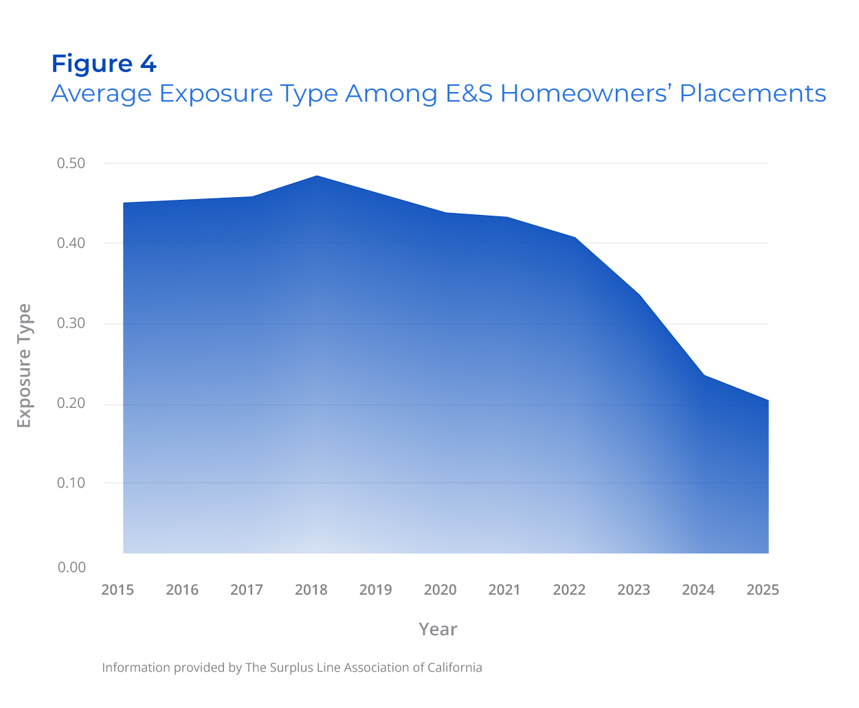 This shift is independently reinforced by the trend in exposure type, shown in Figure 4. In this analysis, exposure type represents the modeled degree to which a location is exposed to nearby wildland fuels, with values ranging from 1 (direct exposure within burnable vegetation) to 0 (little to no modeled exposure). Portfolio‑wide exposure type has declined sharply, falling from 0.44 in 2020 to 0.34 in 2023, and then to 0.20 by 2025. This indicates that the properties entering E&S are becoming less connected to wildland fuels.